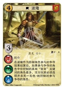 在波隆作为防御角色参与的争夺效果结算后,如果参与争夺的角色中你控制的具有“致命”关键词的角色最多,攻方玩家必须选择并杀死一名他/她控制的参与争夺的角色。
